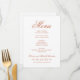 Formell terracotta orange bröllop-menykortsdesign har en vacker typografi som kombinerar ett traditionellt blomstrande kalligrafiskt skript med klassiskt blockeringsuttryck. Innehåller en dekorativ dekorativ dekorativ dekorativ dekorativ dekorativ rulla. Anpassningsbarna kan vara personlig med ett monogram av datumet namn och bröllop och middagsmenyinformationen för bröllopsdagen. Var snäll och se till att vår klassiska Elegant Terracotta Orange Bröllop Collection samordnar designen.