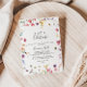Denna klassiska färgstarka vild som låt oss festinbjudan är perfekt för en rustisk förlovningsfest, bachelorettfest, pension, studenten, bröllop efter party eller något evenemang eller party. Utformningen har en gult, lila, vita blommor med vild i ro och grönt med vattenfärg.