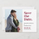 Det här moderna vågrät sparar datumkortet med ett lodrät-foto. "Spara datumet" visas i en grumlig klassisk text med fetstil på en vit bakgrund. På baksidan finns anpassningsbar för bröllop webbplats.