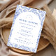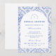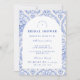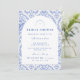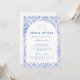 Denna eleganta bröllopsfest-design har ett raffinerat vintage blommönster i klassiska blå och elfenbensfärgade nyanser, inspirerad av traditionella botaniska textilier och ärvda trädgårdstryck. Den dekorativa bakgrunden blandar ömtåliga blommor, ränder och ornamentala mönster som ramar in en graciös välvd layout för evenemangets detaljer. Den tidlösa blå paletten frammanar charmen hos antikt porslin och europeiska trädgårdsillustrationer, vilket skapar en sofistikerad och romantisk estetik. Perfekt för trädgårdsbröllopsfester, klassiska bröllopsfiranden eller eleganta brudfiranden med en tidlös vintage-stil.