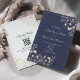 Elegant och tidlöshet, den här vintagens blåa bröllopsinbjudan innehåller guldblommor från chic guld för en aning lyx. Med en bekväm QR-kod för RSVP-onlineer och enkel åtkomst till bröllop webbplats för mer information, är det perfekten som blandar klassiskt sofistikerade och moderna bekvämligheter.