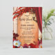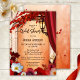 Italien inspirerade inbjudningskort för möhippan med festive Red-blommor på en klassisk Medelhavsbakgrund med en lanter på en romersk båge och färglös höst löv. Baksidan visar färgstarka löv på en målad bakgrund.