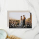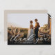 Tack vare elegant bröllop har du ett enda vågrät- eller landskapsinriktat foto med "Tack" överlagt i chicens vita kalligrafiskript, och anpassar dig efter din namn och bröllop-dejt längs grund i klassiska blockbokstäver. Lägg till ett personligt meddelande och namnteckning på baksidan.