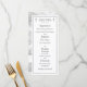 Den klassiska monogrammed Bröllop-meny-designen i Monogrammed-eleganten innehåller texten i en , silver-typsnitt i ett silver gräns. Två små kor visas överst på båda sidor av rubriken. Baksidan har en elegant-fiaux-satinbakgrund till parets nya efternamn, som visas med stora, vita bokstäver. Under detta visas parets namn och datum för bröllop mot en vit baksida.