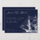 Föreställ er gästerna med det här klassiska bröllop spara datum-kortet. Det här klassiska kortet innehåller en vintage som illustrerar en fregattsegelbild som du kan ersätta med en frakt av det mål där du ska gifta dig (transparent bakgrund föredras). Elegantens vita bokstäver på en mörk blått bakgrund visningar bruden och brudgummen i namn och detaljer om bröllop, inklusive plats, datum och att en formell inbjudan kommer att följa. Bläddra i min samling efter matchande inbjudningssvit. ⚠ Om du vill redigera de speciella tecknen för calligraphy & använda kopierar och klistrar du in dem från den här sidan: bit.ly/Emeline-Script ⚠ ・ ・ Designat av JessicaAmber. Om du vill ha fler elegant bröllop-paket kan du besöka min butik Zazzle.com/EventsByJessicaAmber ・ ・ För anpassningsbar order, meddela mig på Zazzle