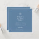 En klassisk men modern fyrkantig dopinbjudan i djupblått, med subtila övre och nedre ränder, ett handmålat skal med ett kors och ett mjukt skrivstilssnitt för en elegant och meningsfull look.