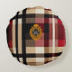 Uppgradera dina vardagsrum till en helt ny nivå med denna klassiska runda rutiga kudde i rött, svart och beige med monogram.