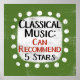 En rolig typografisk design som säger "Classical Music: Can Recommend, 5 Stars". Det är svart och röd text på en vit rektangel med funky, lekfulla vita prickar runt den, allt på gröntens bakgrund.