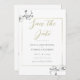 Grenar av vita orkidéer, handritade med grafitpenna, dekorerar detta enkla men sofistikerade, eleganta men chic bröllop spara datumet som har en delikat guldram. Hints av guld i färgen på skrivningen ger detta en festlig men dämpad färgglädje.
