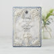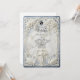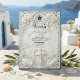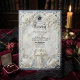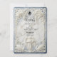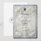 Skapa en stämning av stor elegans för din herrgårdsbröllop med denna design med en falsk basrelief barockbåge, musikaliska änglar och en romantisk blå palett. Denna design har en mycket detaljerad, tryckt simulering av klassisk arkitektonisk utsmyckning. En central valv, utförd i stil med 3D-vit gips, inramar textinformationen mot en falsk dammig blå bakgrund. Konsten inkluderar intrikata basrelief-effekter av blommande vita rosor, akantussnideri och två svanar vid basen. Överst på pelaren lägger en kerubängel som spelar fiol till en känsla av rörelse. Typografin blandar ett utsmyckat kalligrafiskt manus med ett traditionellt serif-tecken i mörkgrått kol för läsbarhet. Detta är en