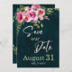 Klassisk smaragdgrön, burgunder och rosafärgade rosor blomstergestaltat rustikt mörkt sago tema stämningsfullt bröllop inbjudan Save the Date-kort