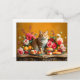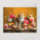 klassisk stillebenmålning som visar en katt mitt i ett överflöd av färska frukter och blommande blommor.