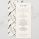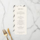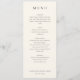 Denna eleganta bröllopsmeny har en minimalistisk design med rena linjer och rikligt med vitt utrymme, vilket skapar ett sofistikerat och förfinat utseende. Färgpaletten är enkel, med svart text på en elfenbensvit bakgrund för hög kontrast och läsbarhet. Typografin spelar en nyckelroll, med feta serif-typsnitt som framhäver sektionsrubriker och ett snyggt sans-serif-typsnitt som listar menyalternativen, som inkluderar förrätter, sallad, huvudrätt och efterrätt. Den övergripande stämningen är klassisk och formell, perfekt för ett exklusivt evenemang, medan den raka layouten säkerställer tydlighet och lättläst.