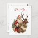 Tack-kort med en rolig julillustration. Tomten i sin traditionella röda dräkt ridande på en stor hornprydd ren dekorerad med järnek. Ett julgran i bakgrunden.