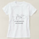 Designen visar en elegant minimalistisk dam-T-shirt i svart och vitt. En vacker unik "mrs"-text i fantasifull kalligrafi högst upp och ett anpassningsbart efternamn och datum längst ned. Designen är extremt unik och klassisk och kommer att vara en elegant present till alla brudar eller nygifta.