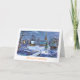 Klassiskt, vackert årgång Julhälsningar julkort bild. En fredlig vintersnövärld med vitt snö, träbro, isflod, snönära träd och varma familjehus.