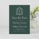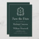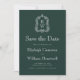 Den här vintage-inspirerade bröllop spara datum-designen har ett par vit monogram initialer i öppet serif-teckensnitt ovanför och nedanför en skiljelinje och omges av en konturkonst-vapensköld på en grönt i mörken. Kortets baksida är en solid grönt i skogen.
