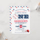 Första födelsedagsinbjudan med ett basebolltema, med en klassisk vit bakgrund, marin blå och röd text, en baseboll, stjärnor, en hjälm med fladdermus och boll och en modern födelsedagsfest som är enkel att anpassa.