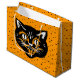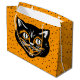 Den här presentpåsen är orange med en spridning av små svarta stjärnor och en klassisk happy halloween svart katt ansikte på framsidan och baksidan.