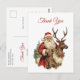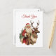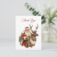 Tack-kort med en rolig julillustration. Tomten i sin traditionella röda dräkt ridande på en stor hornprydd ren dekorerad med järnek. Ett julgran i bakgrunden.