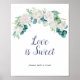 Denna klassiska vita blommor love is sweet bröllopsskylt är perfekt för ett vårbröllop. Den eleganta blomsterdesignen har mjuka elfenbensvita och vita rosor, peonior och krysantemum med inslag av blå vattenfärgblommor och grönt bladverk. Anpassa texten till vad du vill!