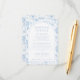 Elegantens ljusblå blommigt porslinjer inspirerade bröllop-detaljkort med bohemisk båge och brud och groom namn längst bak.