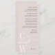 Monogrammenyer för elegant till bröllop eller repetitionsmiddagen har initialer i nedre lämnat hörnet, gått med med ett ornat svopande "och," på en blek grå bakgrund.