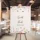 Detta klassiska färgglada vildblomma-gästboksskrivtecken är perfekt för ett modernt bröllop eller brudshow. Designen har gula, lila, vita vildblommor med lövverk i en rosa och grön akvarellbakgrund.