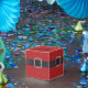 Klassiskt Jultomten svart bälte med silver-låsbeslag och röd krossad sammet struktur omgivande ruta. Vintage "God jul"-typografi ovanpå lådan.