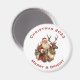 En magnet med en roligt julillustration. Jultomten i sitt traditionella röda kostym rider en stor, skrynklig renar som dekoreras med holly. En Julgran i baksidan.