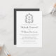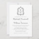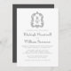 Den här vintage-inspirerade bröllopsinbjudan innehåller ett par initialer i monogram i ett öppet serif-teckensnitt ovanför och nedanför en skiljelinje och omges av en konturkonst som vapensköld på vit bakgrund. Kortets baksida är fast kol-grått.