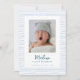 Det klassiska handdragna presenterna av Blåstripe-fågelannonsen var ett omhuldat ögonblick i det klassiska stil. Fånga in det rena kärnan i den glädjande resan till föräldraskap med detta födelsemeddelande. Det här tillkännagivandet är ett perfekt sätt att presentera din lilla glädje för världen. Ditt värdefulla nyfödda foto ligger i ett ekologiskt handritat, blå, randigt gräns, i centrum, omgivet av traditionens hetta och löftet om en ny början. Det blå rand:s mjuka och milda nyanser visar en känsla av lugn och tillväxt som symboliserar det nya kapitlet i er familjs historia. Alla detaljer är designade för perfektion - från rand konstnärliga, ofullständiga drag som utstrålar en autentisk känsla till den högkvalitativa papper som ger en smula elegans. Den klassiska utformningen är en nod på kärlek och familjens tidlösa natur, som ser till att detta tillkännagivande kommer att uppskattas inte bara av er utan också av dem som har turen att ta emot det. Vare sig du delar nyheterna med nära familj och vänner eller skapar ett meddelande till en större krets, kombinerar detta födelsemeddelande helt enkelt tradition och contemporary estetik. Det är inte bara en biet av pappert. Det är en biet av ditt hjärta, en symbol för kärlek som har blommat i och med din lilla annans ankomst. Fira livets mirakel, tillkännage att baby kommer och sprida glädjen med detta klassiska födelsemeddelande. En keepé som fångar kärnan av ett ögonblick, som alltid är inramad i det handdragna blå rand - ett gräns som betecknar det gränslösa kärlek och glädjer er er nya färd åt. Ta med ytterligare ett foto och information om den nya personens ankomst på baksidan av kortet.