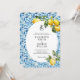 Utformningen har en levande utformning av eleganten med blå mönster mellan Medelhavet och stil kring en central vit oval. Monogrammet överst ger en personlig beröring, medan citronillustrationerna ger en frän, omtyckt känsla. Inbjudan visas i ett klassiskt, sofistikerat teckensnitt där gäster bjuds in till bröllop på en bildplats. Den totala estetiska föreningen består av traditionellt och starkt inslag, skapar det både tidlöst och livligt.
