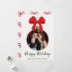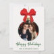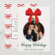 Ett vackert klassiskt sätt att skicka julhälsningar! Detta anpassade familjefotokort har din bild ramad inuti en festlig julgransprydnad med ett glatt rött band. Det traditionella röda och gröna färgschemat och det lekfulla upprepade bandmönstret på baksidan gör detta till ett utmärkt val för familjer som älskar tidlösa, festliga och traditionella julhälsningar. Perfekt för din årliga familjefotouppdatering.