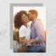 En enkel men elegant sparar datumfotokortet för att meddela din förlovning och kommande bröllop. Fotot med ett lodrät har vit text i grund med gott om utrymme för namn och stora dagdetaljer.