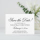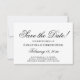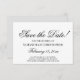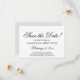 Det här vackra Spara datumkortet är enkelt, snyggt, klassiskt och elegant. Den har äldre skriptbokstäver med svart bläck på vit bakgrund. Kortets baksida är blek grått. Vackert, underskattat, men ändå tidlös och formell.