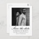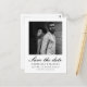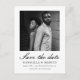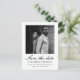 Enkel och elegant svart och vit två vykort för bröllop spara datum-annonsering har ett vackert kalligrafiskt skript på framsidan med ett foto och ett andra bågformat foto med information om bröllop webbplats och returadress på baksidan av det klassiska vykortet för bröllop-meddelande. Köp den här chic bröllop-samlingen för att samordna bröllopsinbjudningar och ytterligare moderna alternativ för färg.