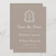 Den här vintage-inspirerade bröllop spara datum-designen har ett par vitt mongram initialer i öppet serif-teckensnitt ovanför och nedanför en skiljelinje och omges av en botanisk vapensköld av konturteckningar på en taupbakgrund. Kortets baksida är en solid taupe.