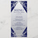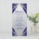 En klassmeny med en silver-geometrisk design på en djup marin blå bakgrund med en sprinkle av silver glitter. Du kan lägga till information genom att klicka på menyn Anpassa. Detta är en del av en klass i bröllop som innehåller en inbjudan, kuvert, platskort, blöjor och många fler artiklar.