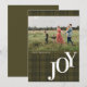Dela GLÄDJE med familj och vänner med detta rutmönstrade julkort med enkel bild. Det har en traditionell rutmönstrad bakgrund och en modern typografisk GLÄDJE-hälsning. Personalisera detta kort med ditt eget namn, år och eget horisontellt foto på framsidan. Välj mellan en mängd olika papperstyper. Välj det rektangulära kortet i storleken 13 x 18 cm eller lägg till en utstansad kantform. Matchande artiklar finns tillgängliga. Perfekt som höst-, höst-, lanthögtid- eller julkort.