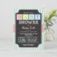 Neutralt babyduschinbjudan med söt chalkboard-stil på ljusteal grönt mönster. Retro chalk känner typsnitt på coolans svarta bakgrund med färgstarkt pastellblock färg, rosa, grönt, teal och blått vintage fransk baby alfabet i stil. Underbar för pojke eller flicka.