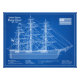 Denna slående blå kopia-stil poster visar det historiska amerikanska klipparfartyget Flying Cloud, ett fartyg som firas för sin anmärkningsvärda hastighet och graciösa design. Byggt 1851 i East Boston av den berömda skeppsbyggaren Donald McKay representerade fartyget toppmodern klipparfartygs-teknik under segelhandelns guldålder. Den vita linjedragningen mot den djupblå bakgrunden liknar traditionella tekniska ritningar och ger bilden en teknisk men ändå konstnärlig kvalitet.
