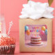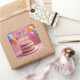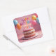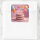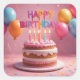 En födelsedagstårta med fladdrande ljus, färgglada ballonger, konfetti och en GRATTIS PÅ FÖDELSEDAGEN-skylt pryder detta festklistermärke.