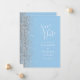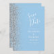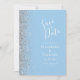 Det moderna bröllop spara datum-kortet från elegantens lämnat kant har ett silver faux glitter gräns. Med anpassadet text kombineras vit handskrift, tryckplåt och kursivt typsnitt på en pastellbakgrund baby blue. Den omvända sidan har en matchande design i blått och silver.