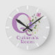 Designen har monogram och namn med blommor på vardera sidan i en pastell vattenfärg stil. Exempel namn är Quiana. Ändra namn som önskat för någon med ett namn som börjar med Q. Barnkammare klocka.