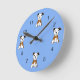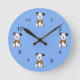 Hundillustration. Karikatyr av leksakshund med brun kropp och öron, vit ansiktsmatning och mage. Bilden sitter på 12, 3, 6 och 9-positioner. Bakgrund i medelblått.