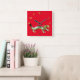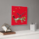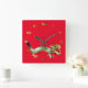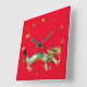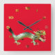 Förgylld drake i grönt och guld, sitter längst ner på klockan. Siffrorna är gyllene färgvärden med metalliskt utseende. Allt på röd bakgrund.