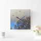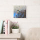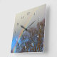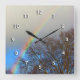 Regnbågsbåge korsar diagonalt över de gråa molnen på himlen ovanför och bakom ett träd med kala grenar. Lägre himmel är blå. Siffror är vita med skugga.