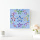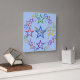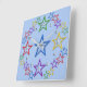 Stjärnkonturer i 3-D-färger (röd, grön, blå, lila, gul). Fem små stjärnor i alla färger i varje hörn. Stor blå stjärna i mitten, röd, gul, lila och grön på 9, 3, 6 och 12 positionerna. Bakgrunden är blekblå.