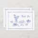 Det här blåvita och vita möhippan-tacket-kortet bygger på den populära, handdragna trenden som präglar Fransk eller italienska stil-livsmedel och -drycker i ett vismiskt, doodlat och klokt stil. Den här designen är perfekt för en möhippa brunch. Det visar hand plockade på ett vas av blommor, champagne, kopp och såser, pannkakor och muffinsar.